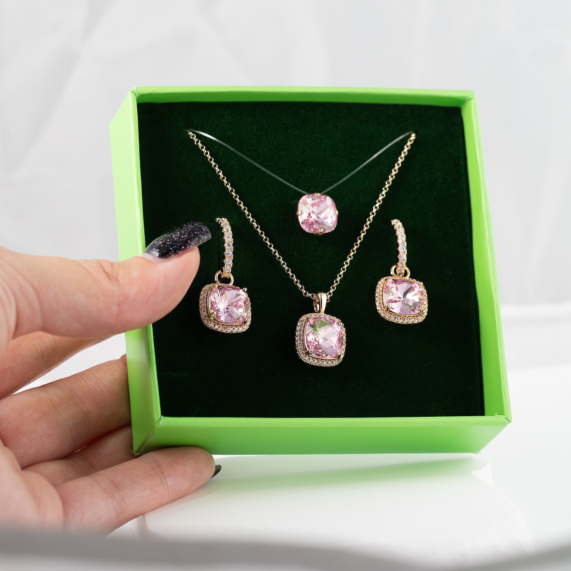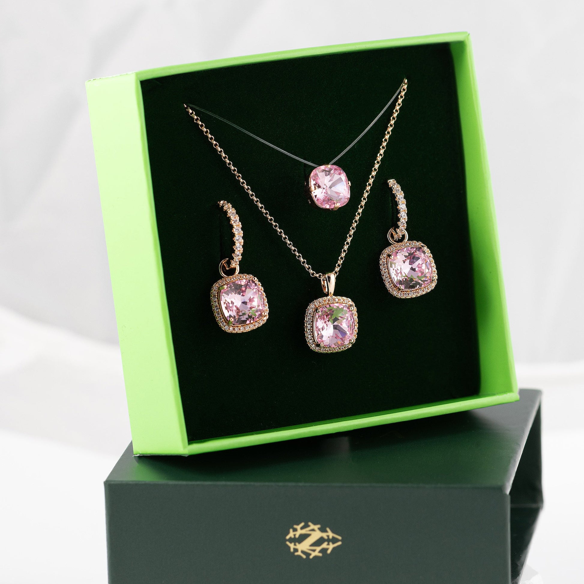 Skaists un smalks rotu komplekts MEŽROZĪTE - auskariņi ar kvadrātveida kristāliem un pieskaņotas kaklarotas! Iegādājoties šo komplektu, saņemsi neredzamo kaklarotu dāvanā. Antialerģiskais rotu komplekta materiāls derēs arī jutīgai ādai.
